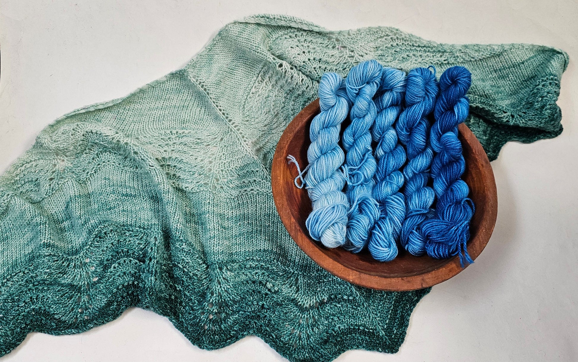 This listing is for a kit includes the pattern and gradient set of mini skeins. This kit is for a bright blue gradient set although I have many color sets available. The sample shawl was knit using the Forest Green gradient set.*