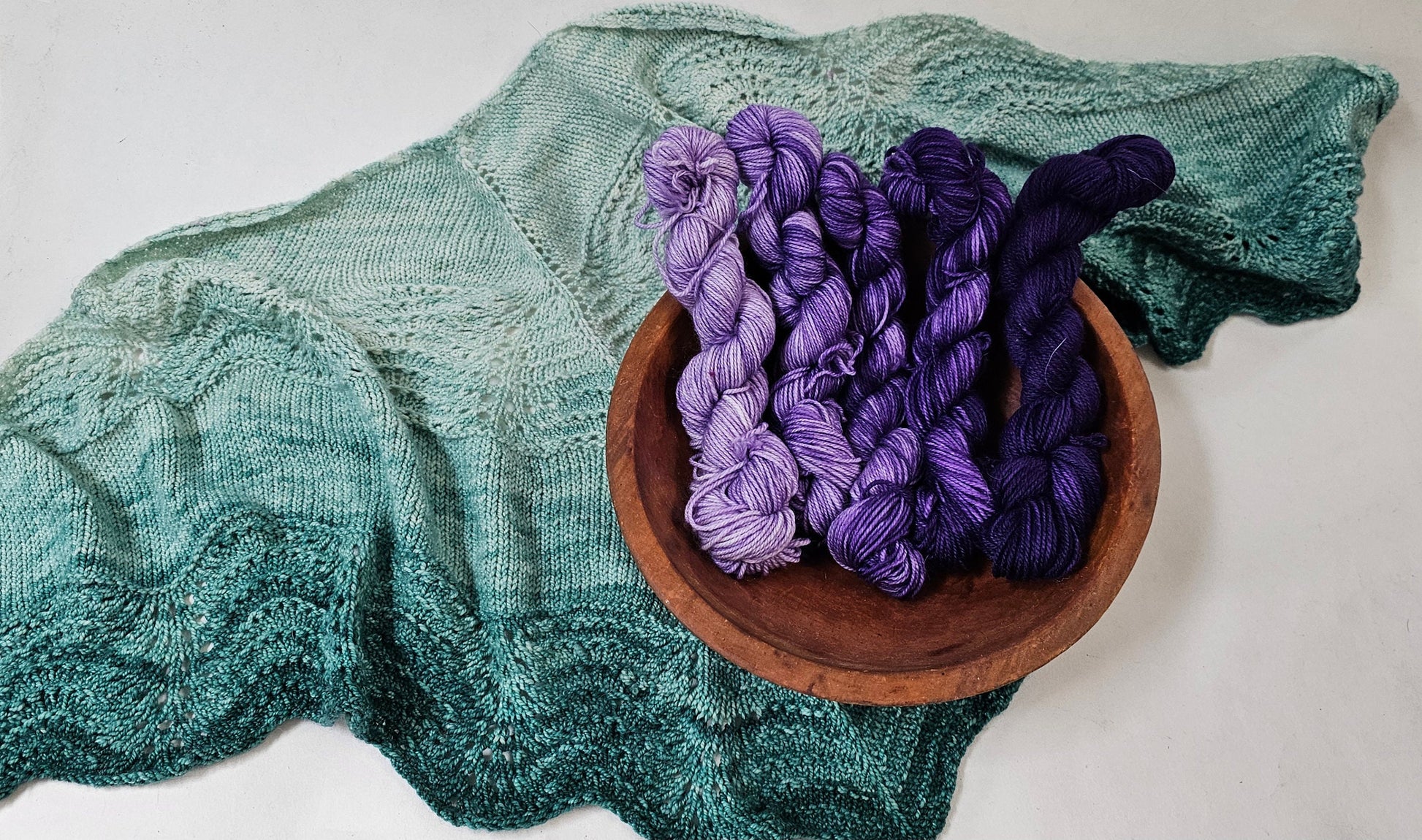 This listing is for a kit includes the pattern and gradient set of mini skeins. This kit is for a Bright purple gradient set although I have many color sets available. The sample shawl was knit using the Forest Green gradient set.*