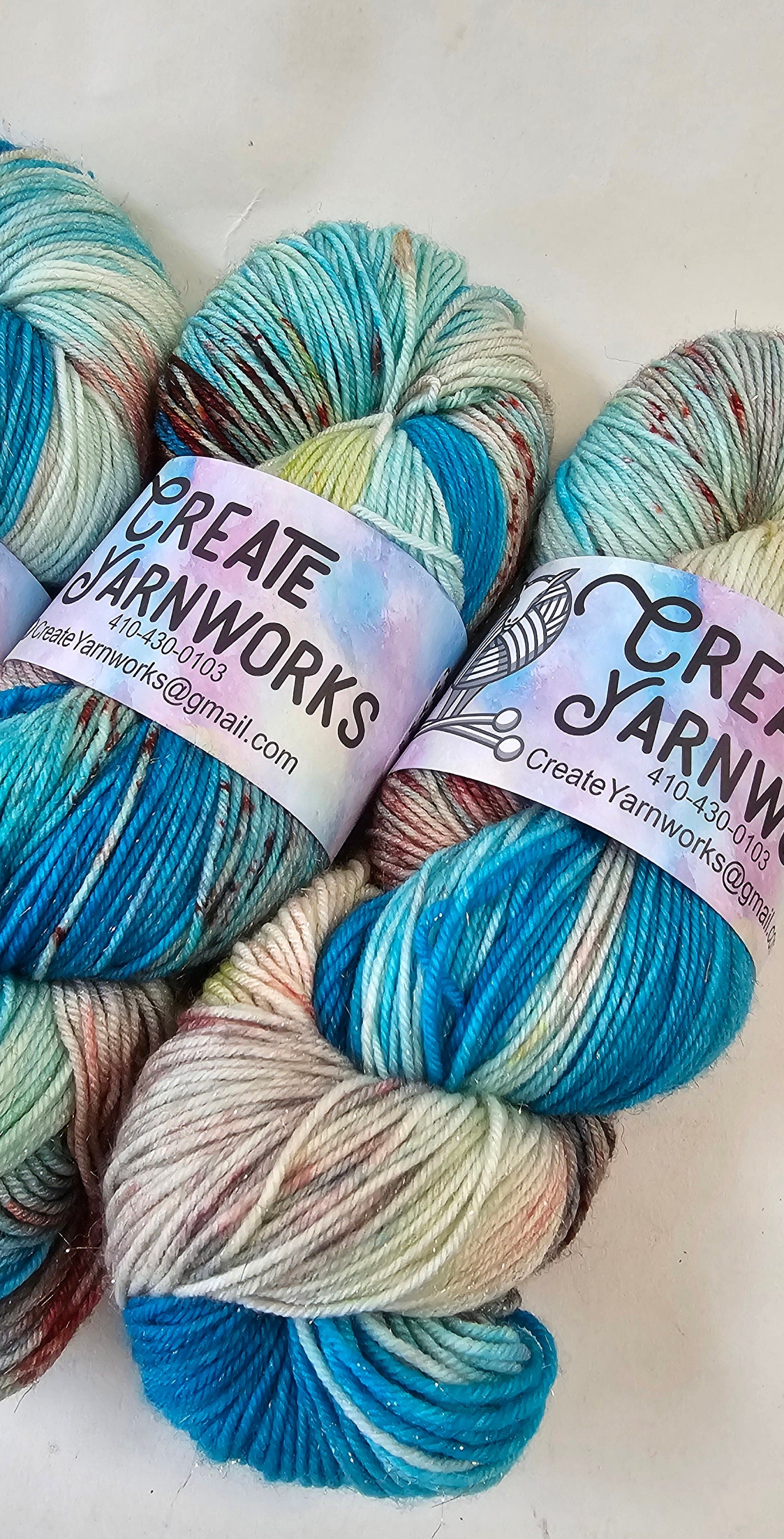 Superwash Merino and nylon are spun with a ply of stellina for a soft, durable yarn with sparkle. There is enough stellina to add sparkle, without scratchiness, and extra fine merino for a soft handle. Add nylon and you have durability too.
